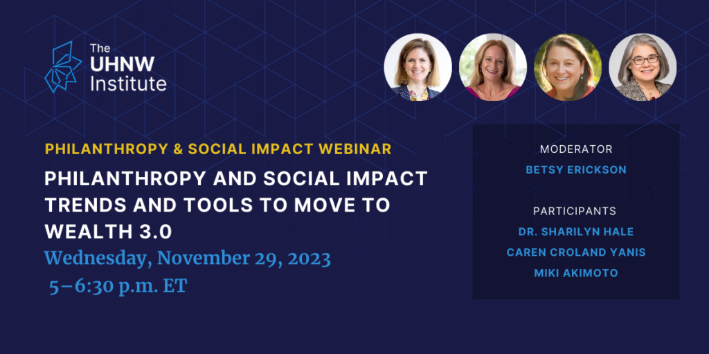 Live Webinar: Philanthropy and Social Impact Trends and Tools to Move to Wealth 3.0 Wednesday, November 29 from 5 – 6:30 p.m. ET As philanthropy touches each of the Ten Domains of Family Wealth, The UHNW Institute is pleased to present its upcoming webinar, Philanthropy and Social Impact Trends and Tools to Move to Wealth 3.0. Join […]