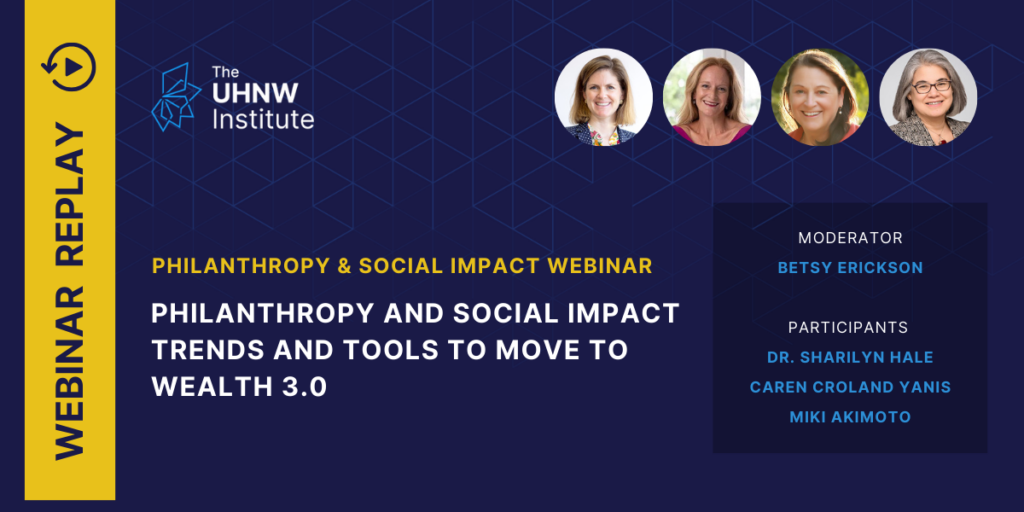 Webinar Replay: Philanthropy and Social Impact Trends and Tools to Move to Wealth 3.0 As philanthropy touches each of the Ten Domains of Family Wealth, The UHNW Institute recently hosted a webinar, Philanthropy and Social Impact Trends and Tools to Move to Wealth 3.0. During this virtual event, experts in the field explored trends in philanthropy and […]