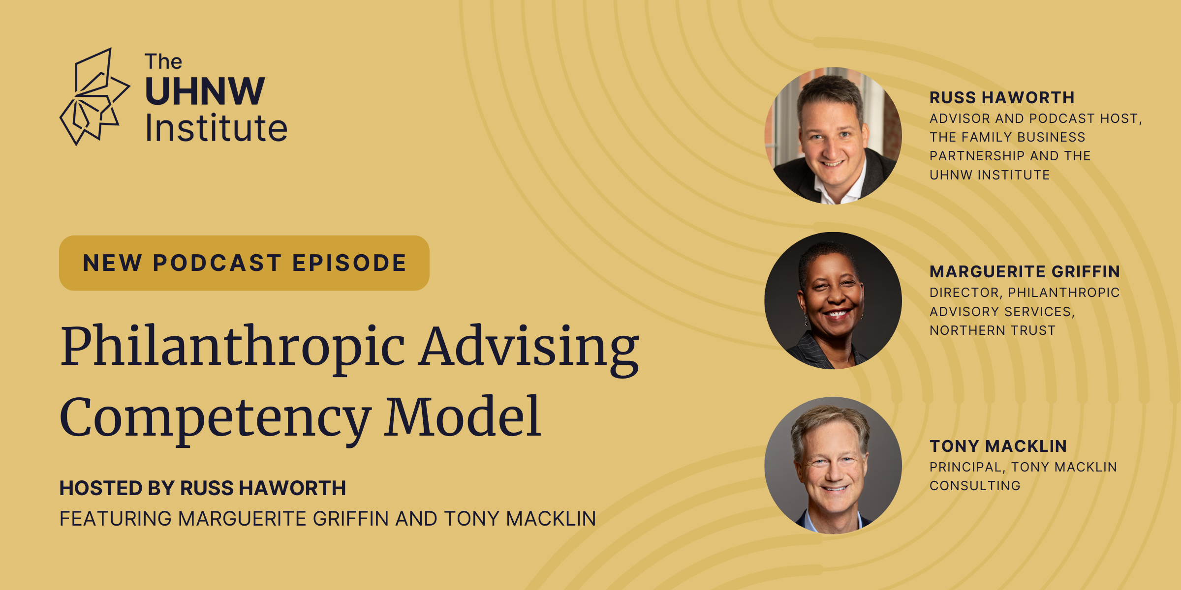 In this episode of The UHNW Institute Podcast, host Russ Haworth is joined by Tony Macklin (Daylight Advisors) and Marguerite Griffin (Northern Trust) for a conversation about the Philanthropic Advising Competency Model developed by Daylight. Together they look at how philanthropic advising has changed, why a structured competency framework matters, and what it takes to align purpose and finance in work with families.