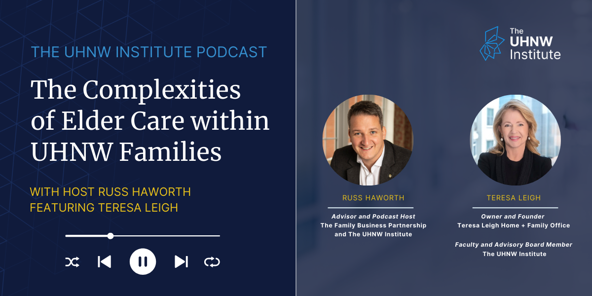 In this episode of The UHNW Institute Podcast, host Russ Haworth is joined by Teresa Leigh, faculty and advisory board of the Institute, as well as owner and founder of Teresa Leigh Home + Family Office. In the episode, Teresa draws from her experience at Teresa Leigh Home + Family Office, nationally recognized expert in private staffing and family advisory, to discuss the layered challenges of elder care in ultra-high-net-worth households.