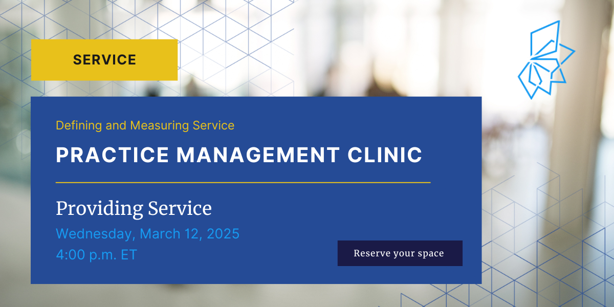 The Institute invites operating executives and practice leaders to attend our March Practice Management Clinic – Defining and Measuring Service. Taking place on March 12, at 4:00 pm ET, this session will focus on the Service pillar of the Building Blocks of Practice Management and discuss providing and measuring service.