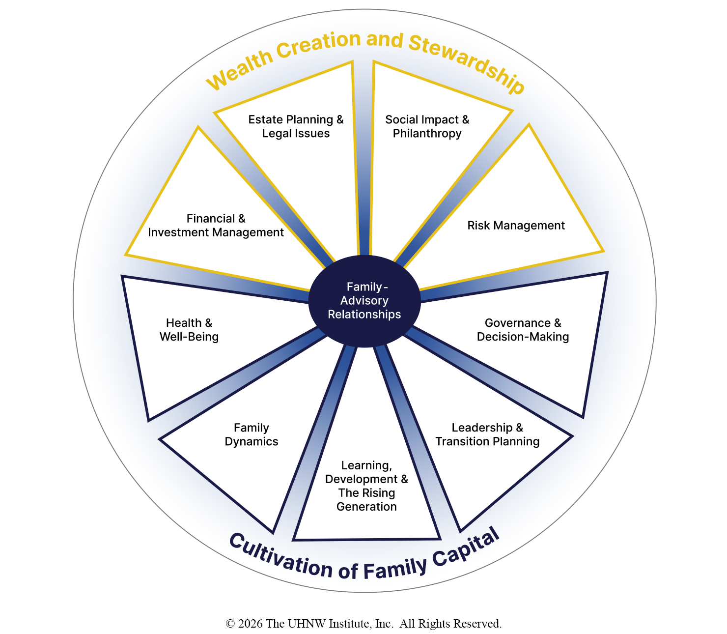 Encompassing the intersection of physical, mental, and spiritual health, wellness, disability, and resilience with the complexities of wealth and the family system.